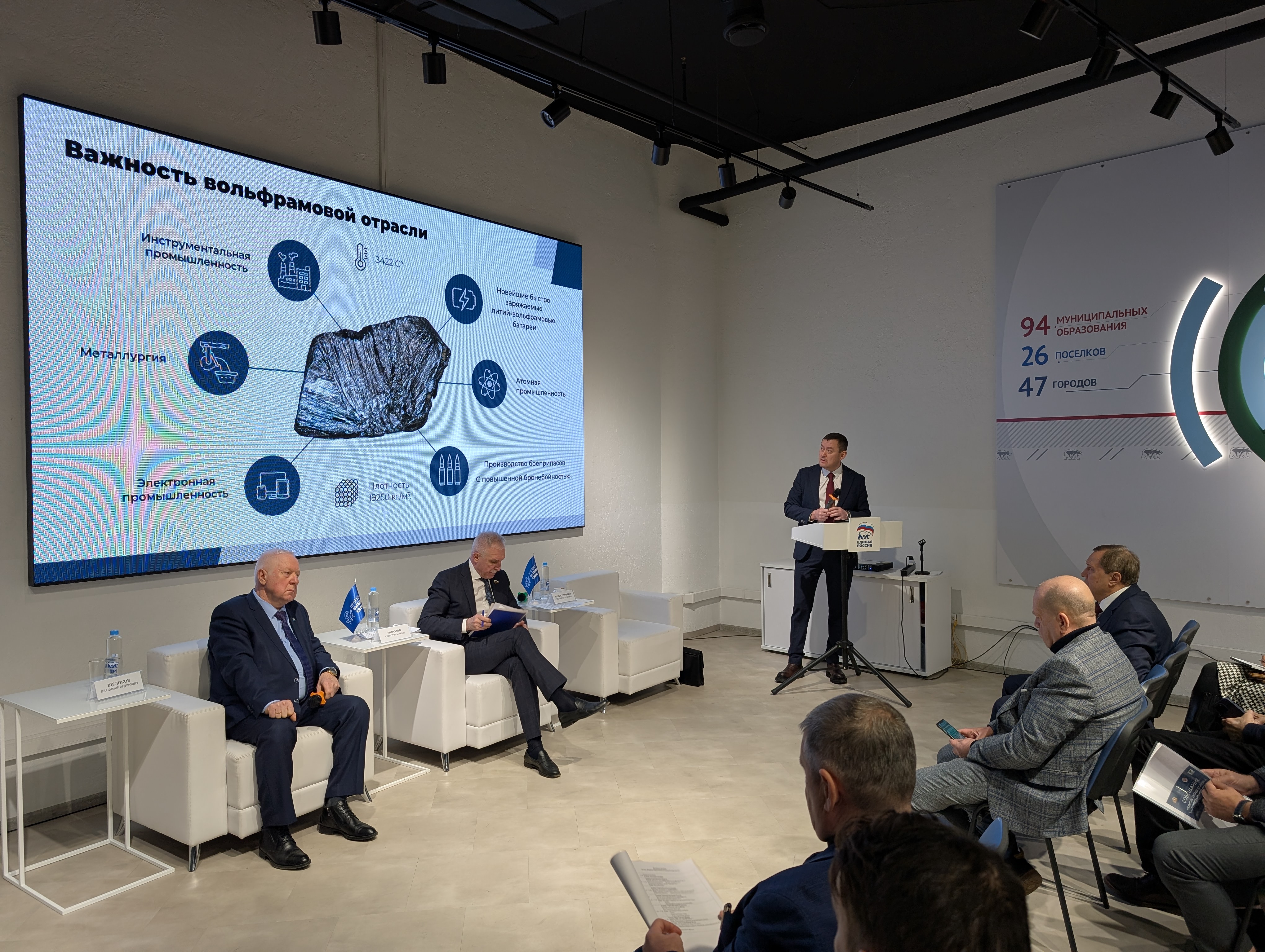 27 ноября в Штабе общественной поддержки Партии "Единая Россия" в Екатеринбурге состоялось важное совещание, посвященное системному развитию российской промышленности в сфере добычи и переработки вольфрама. Участниками совещания стали представители как регионального, так и федерального уровней власти, а также представители промышленного сектора: депутат Государственной Думы, заместитель руководителя фракции «Единая Россия», Координатор партийного проекта «Выбирай Свое» Морозов С.И., Президент Ассоциации "Станкоинструмент Самодуров Г.В., Министр Промышленности и науки Свердловской области Перестронин С.В. и другие.
